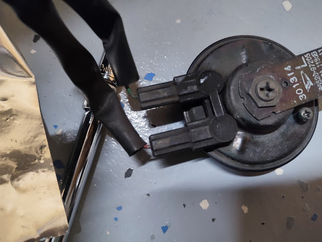 | 左側のフロントグリルから見えるホーンには端子が保護されている |